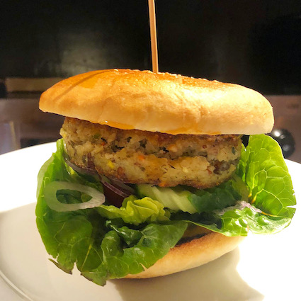 Homemade Bun and Vegi-Patty, Lettuce, Tomato, Onion, Cucumber, 16 Sauce and by choice with Raclette Cheese and / or Local Bacon