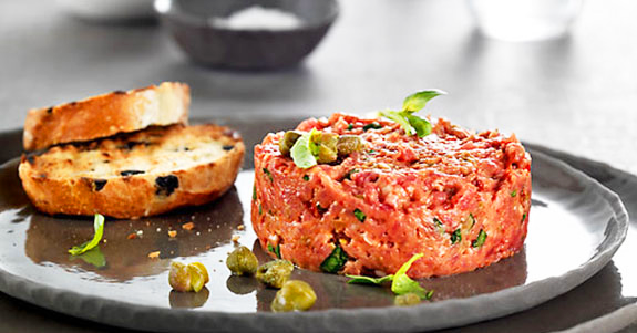 Beef tartare accompanied by its traditional ingredients and brioche toast