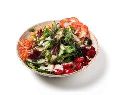 Salad with crunchy vegetables, garnished with fresh herbs.