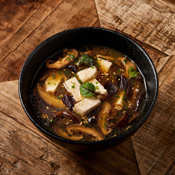 Spicy miso soup with tofu and vegetables.