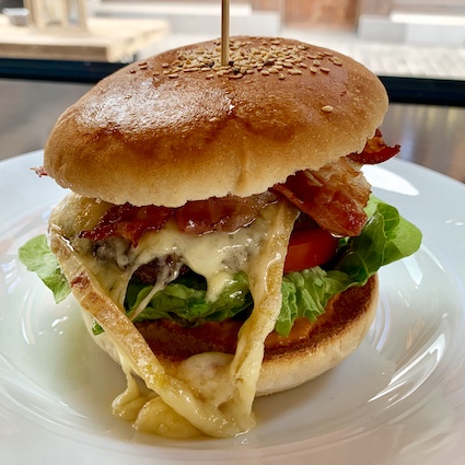 Homemade Bun, Local Beef-Patty, Lettuce, Tomato, Onion, Pickle, 16 Sauce and by choice with Raclette Cheese and / or Local Bacon