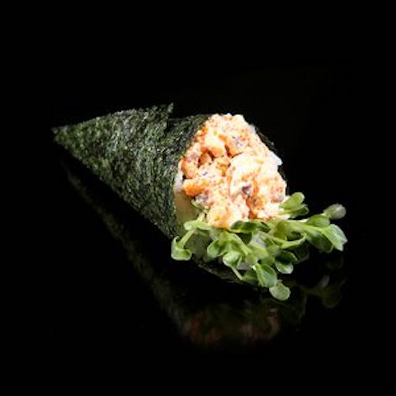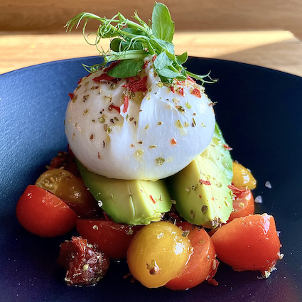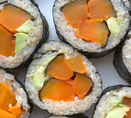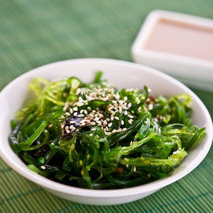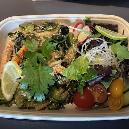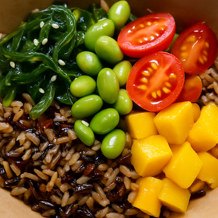 with wild rice, wakame seaweed, edamame, cherry tomatoes and mango (vegan)